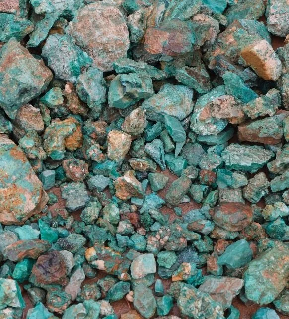 A pile of malachite ore, gathered from the centuries-old mining site at the base of the cliff.