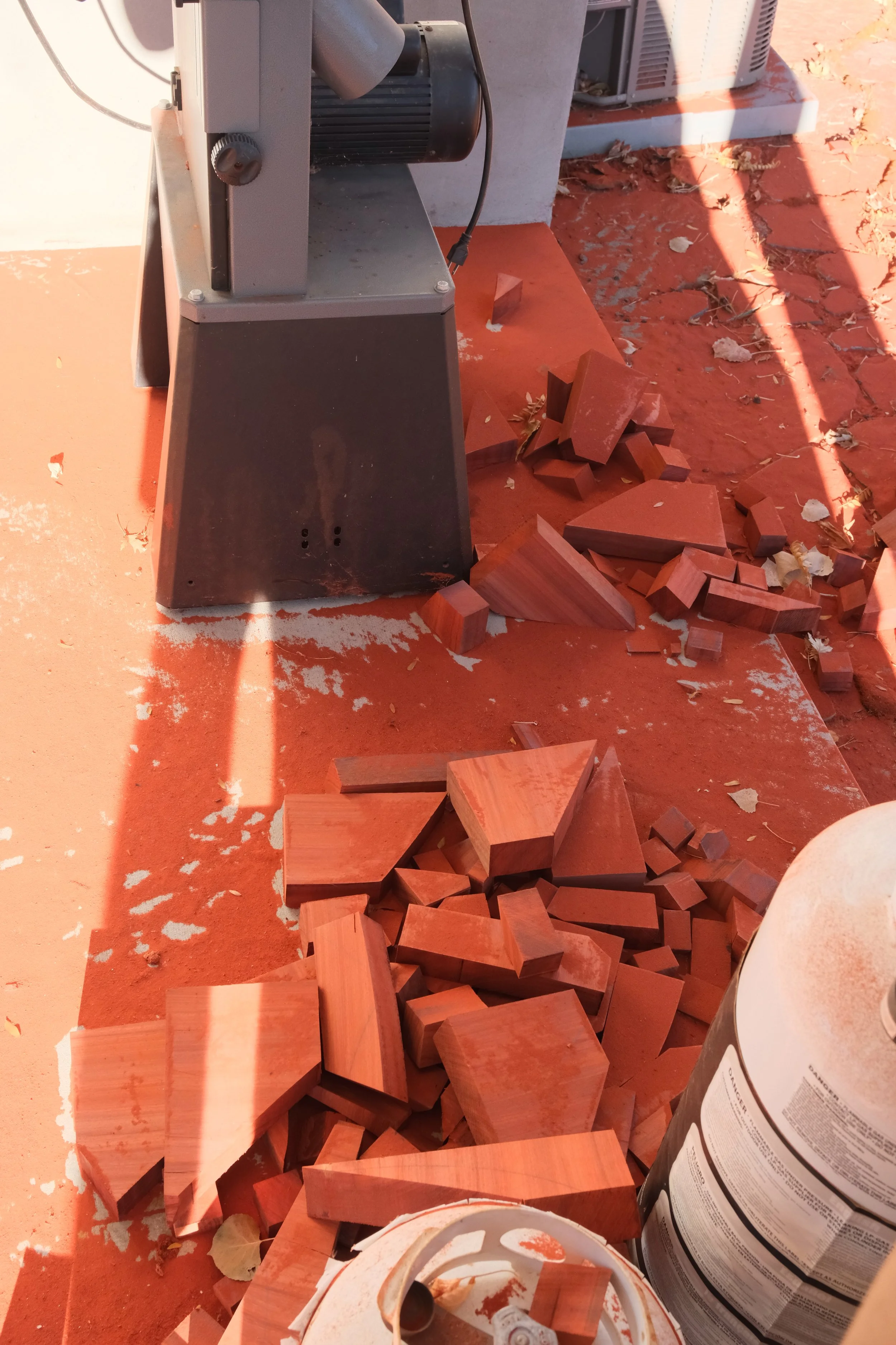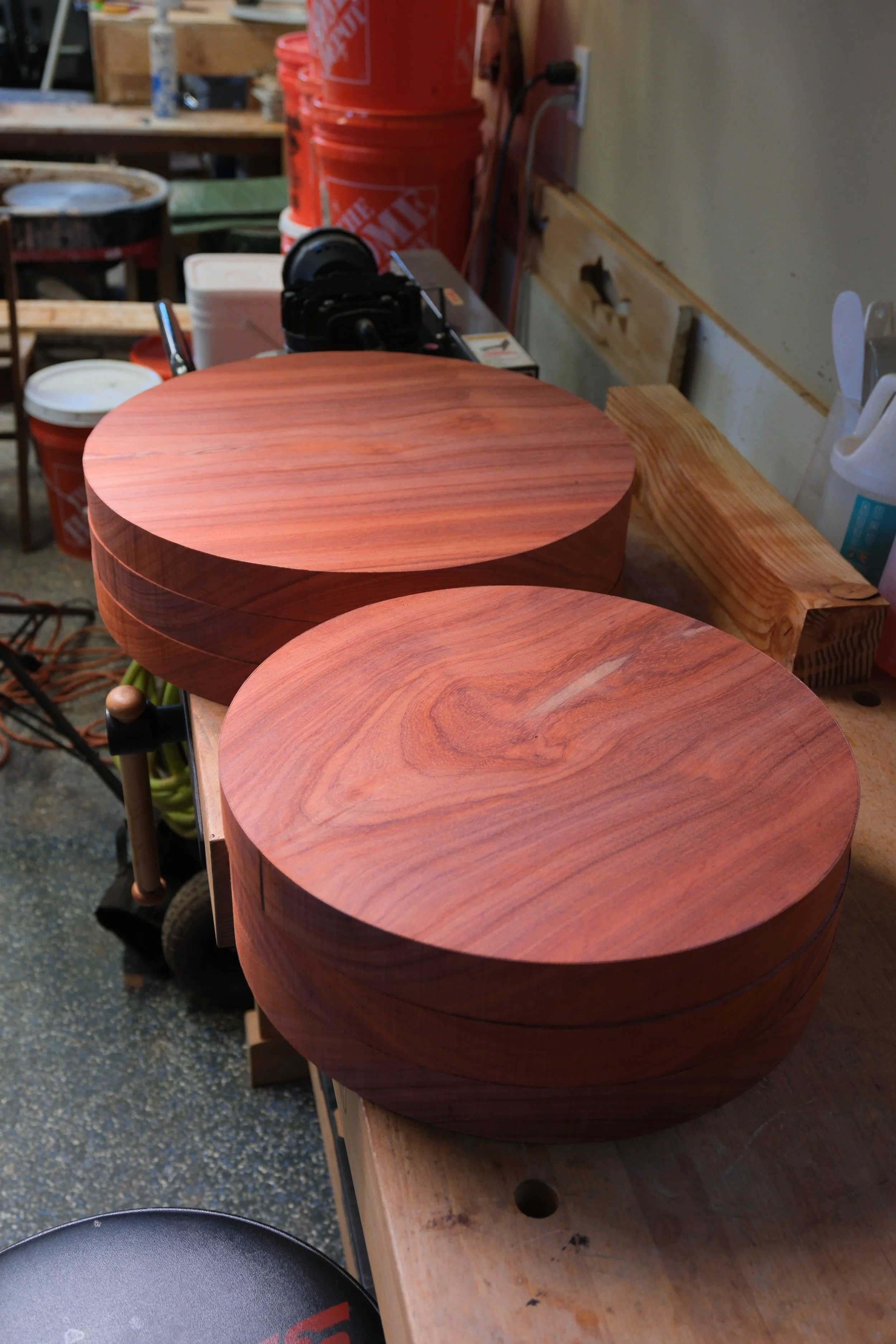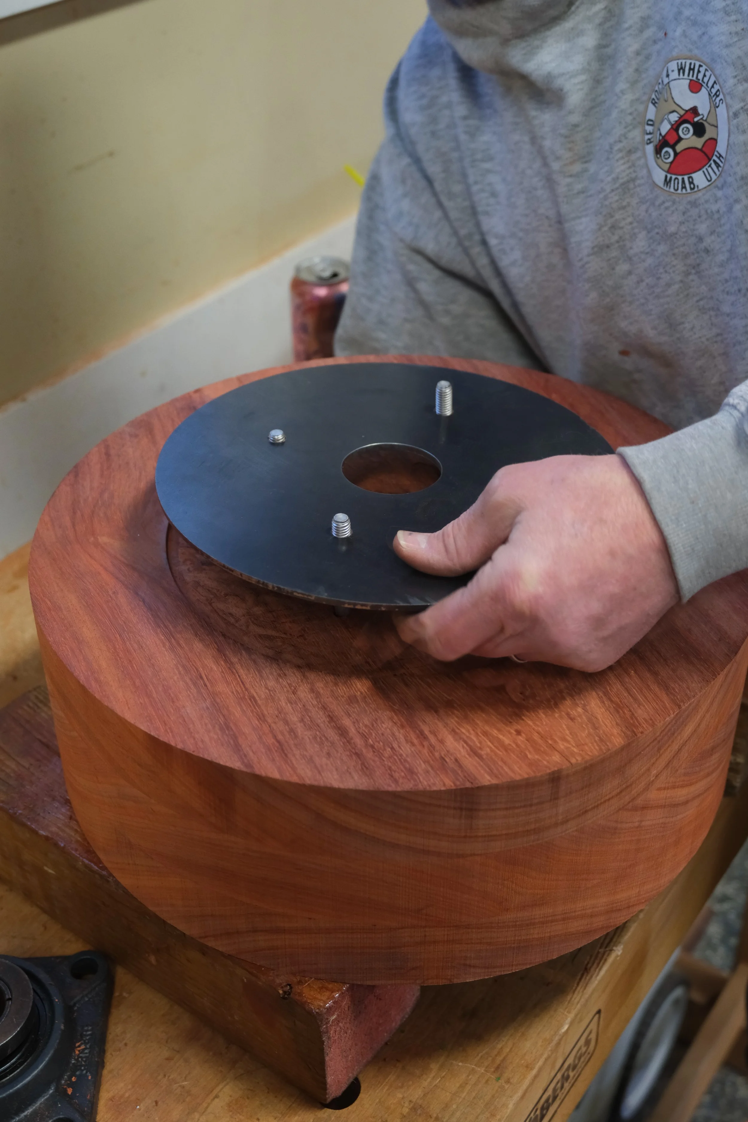 Building the wheel was no easy project. We began by visiting our local hardwood lumber supplier, where we picked up a large slab of padauk and a few boards of walnut. The lumberyard cut the padauk slab into six equal pieces for us. It was heartbreaking to see such an incredible piece of exotic wood sliced up, but we knew it was for a good purpose.