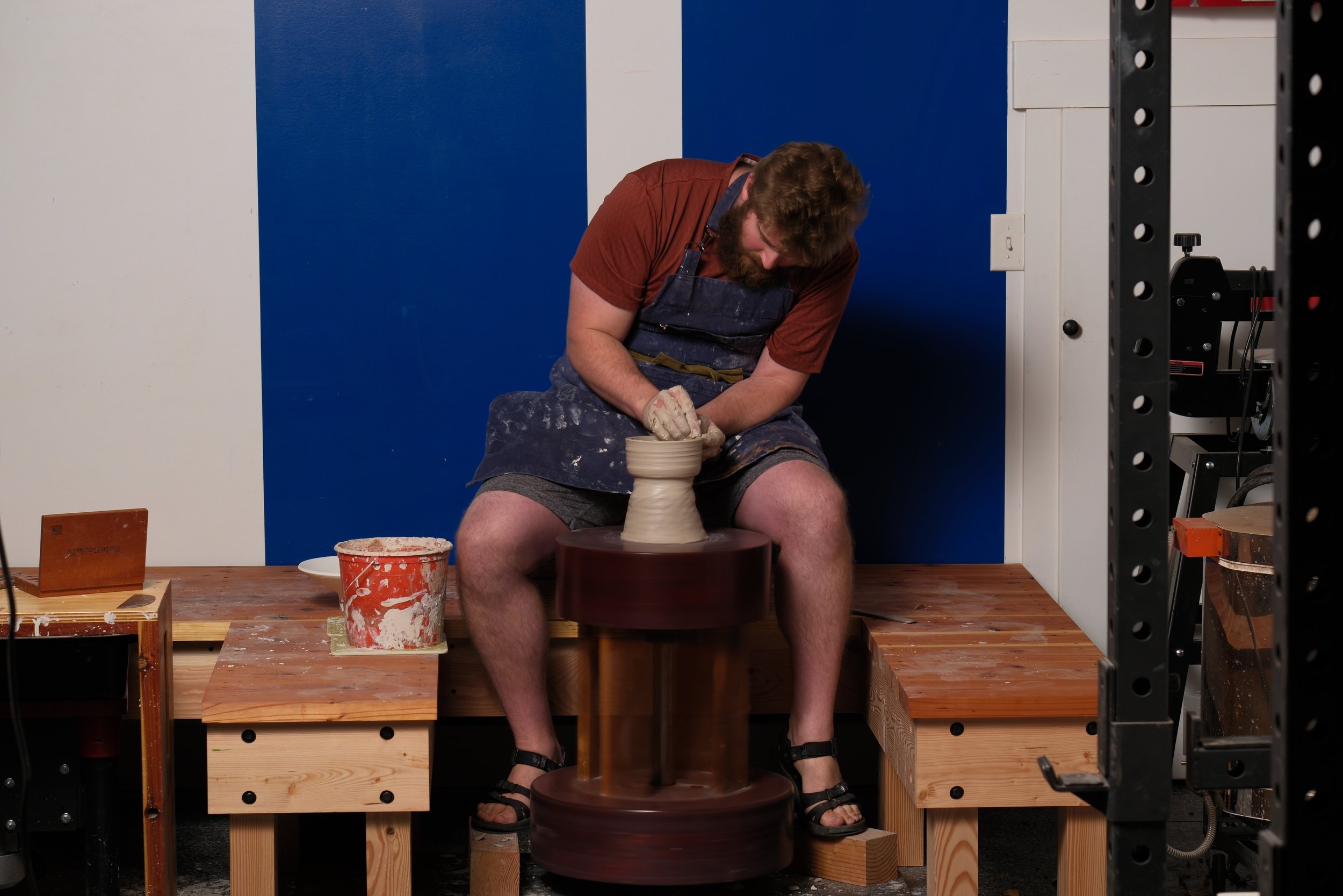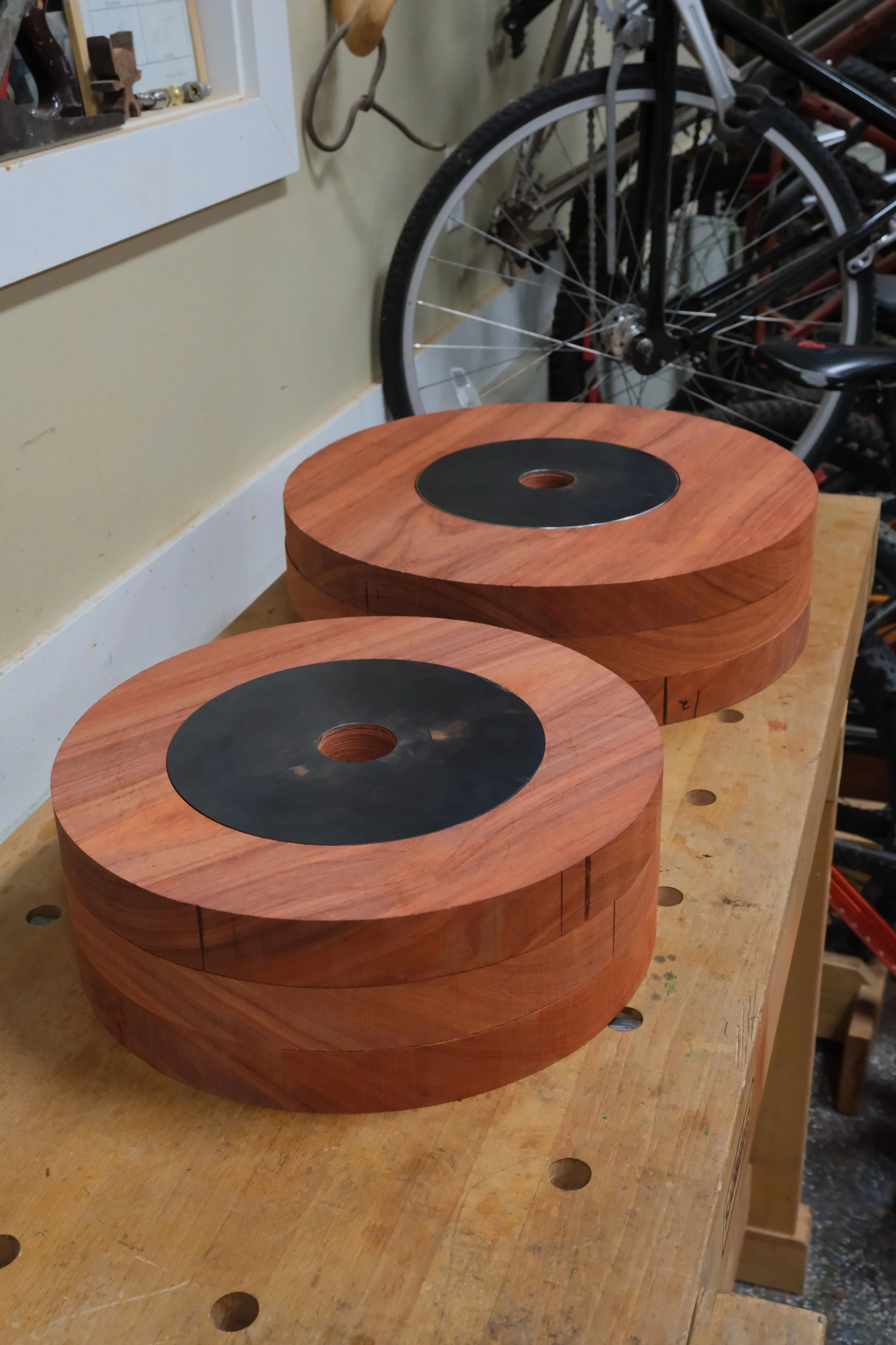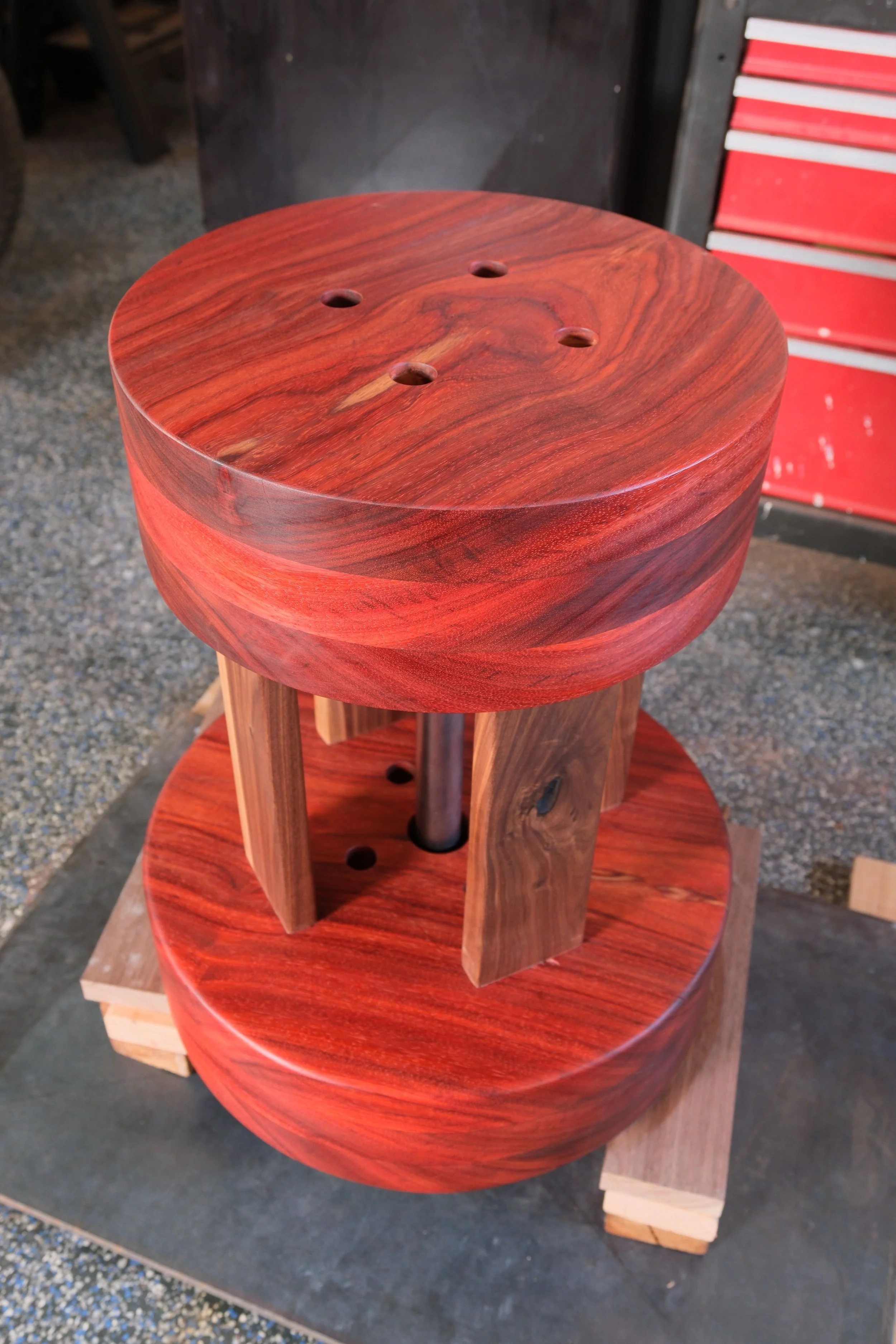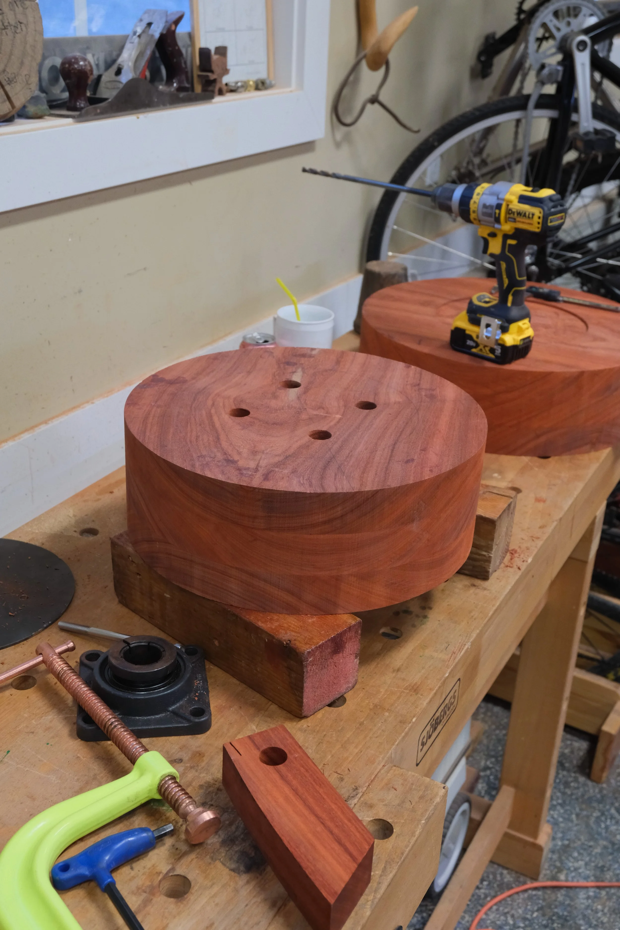 The design of my kick wheel was inspired by traditional Japanese wheels and was built by me and my father, with walnut used for the connecting boards and the top and bottom made from a very large slab of paduak, which was cut up into six equal pieces.