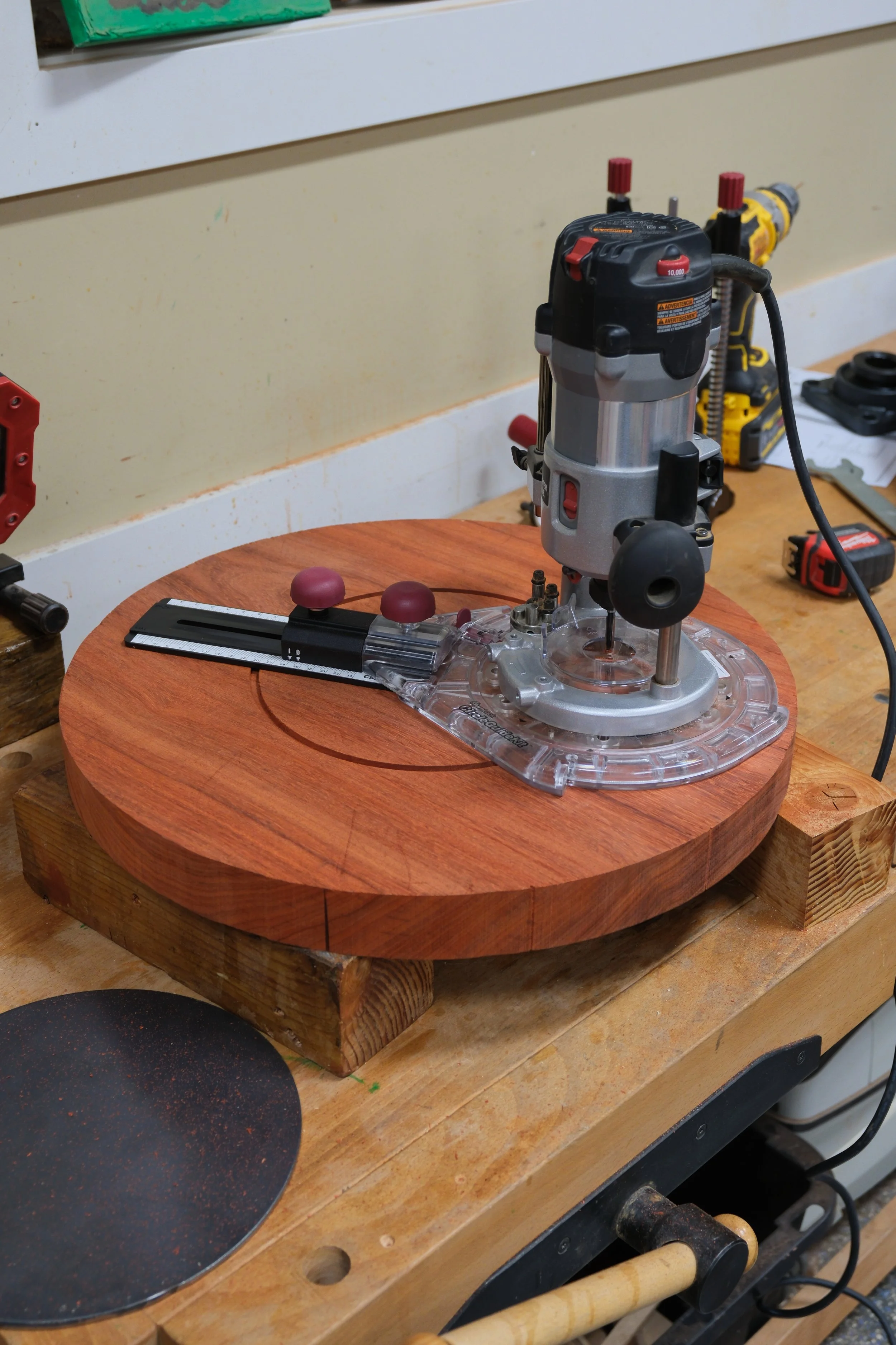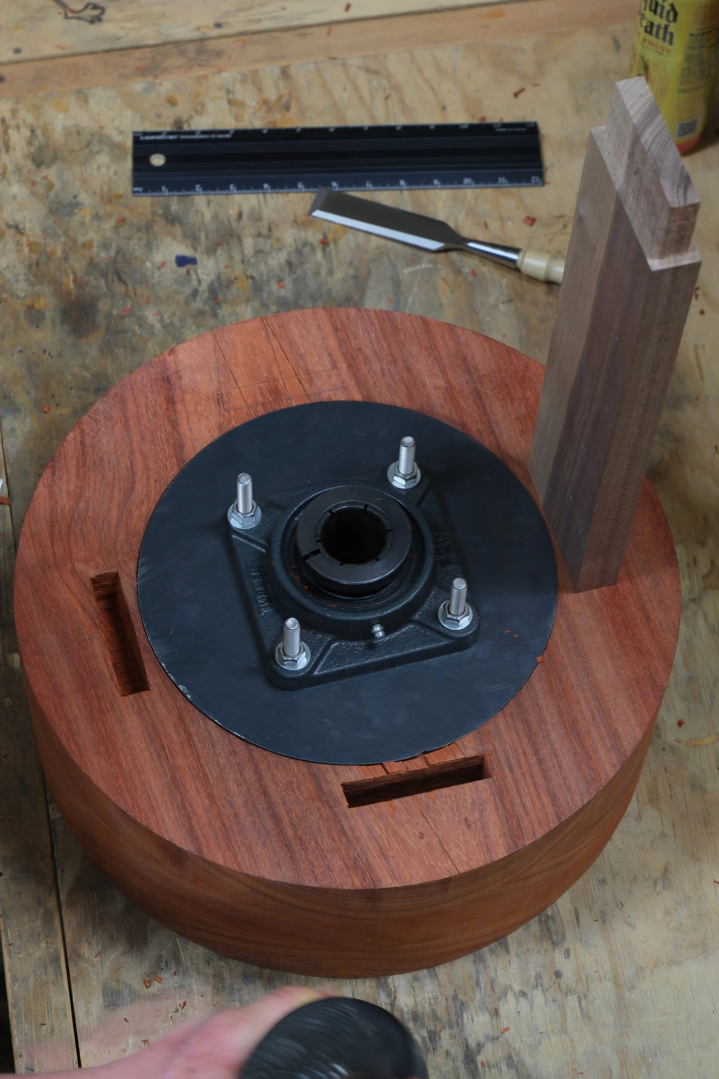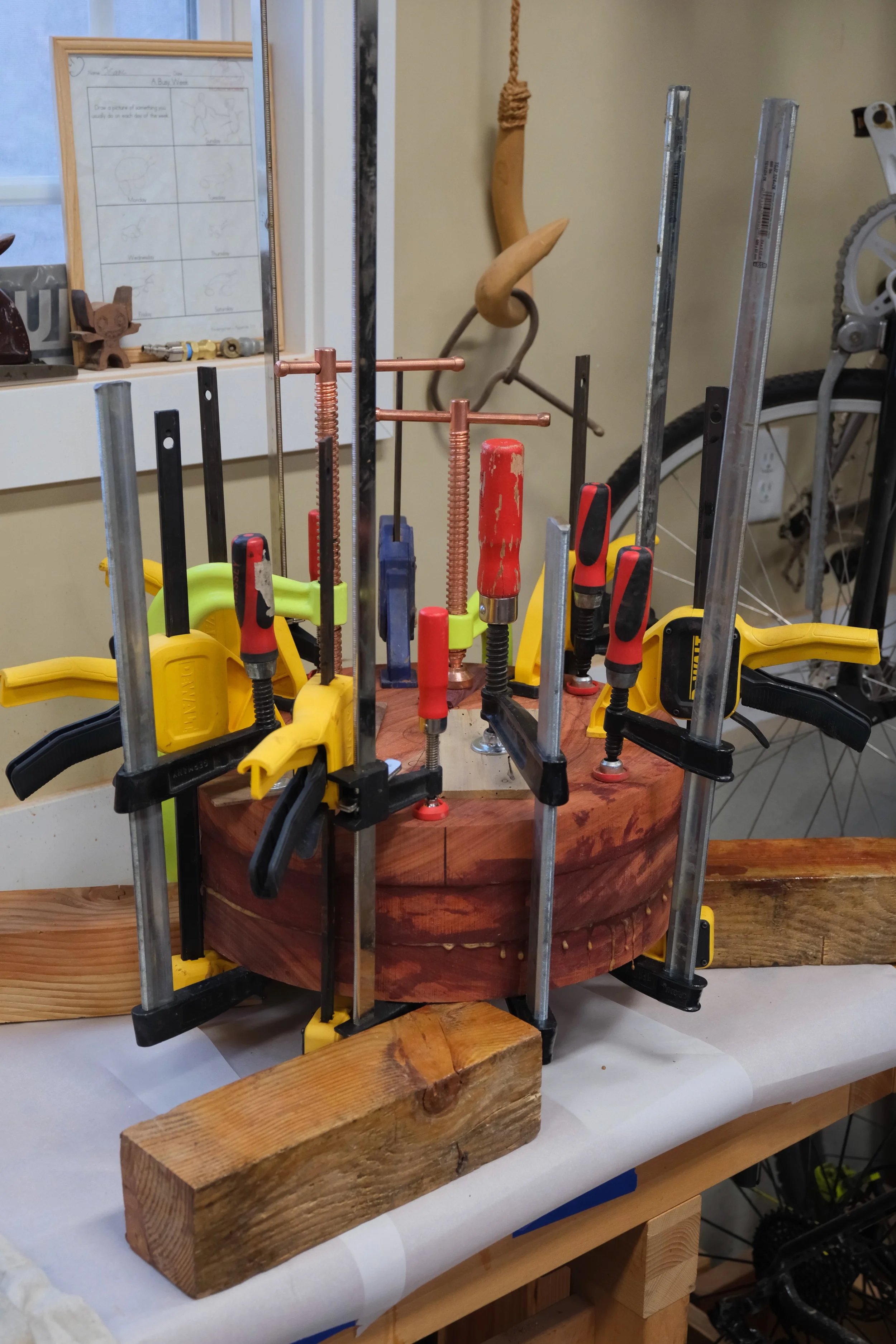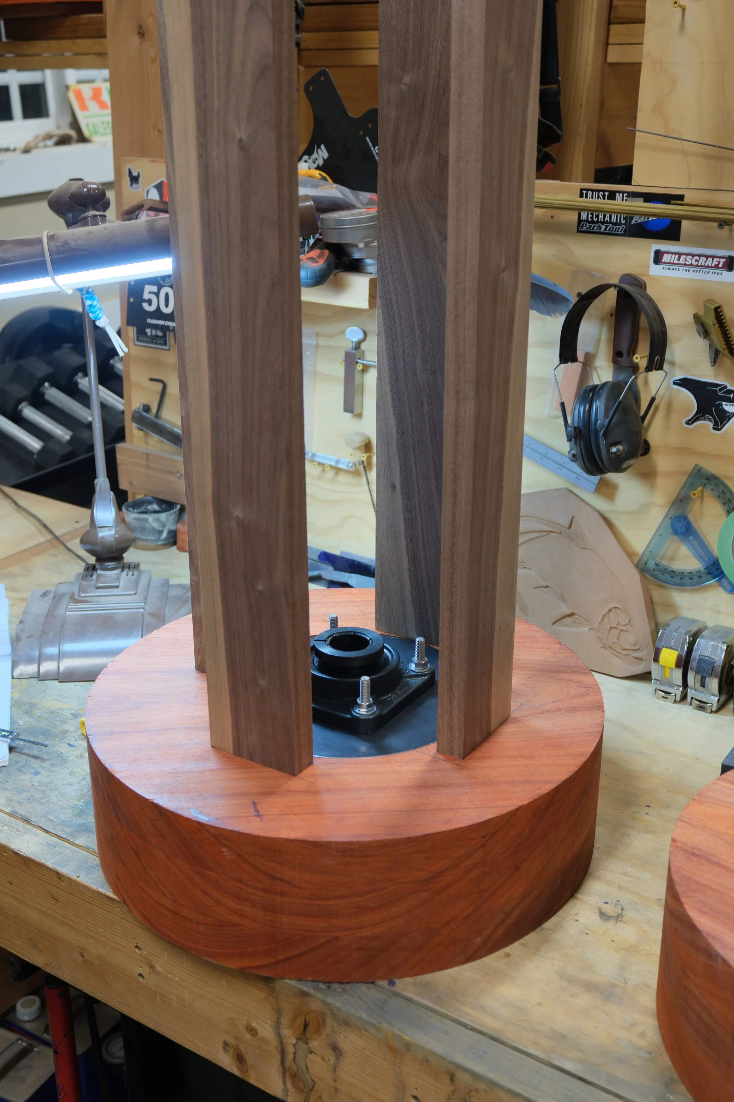 The design of my kick wheel was inspired by traditional Japanese wheels and was built by me and my father, with walnut used for the connecting boards and the top and bottom made from a very large slab of paduak, which was cut up into six equal pieces.